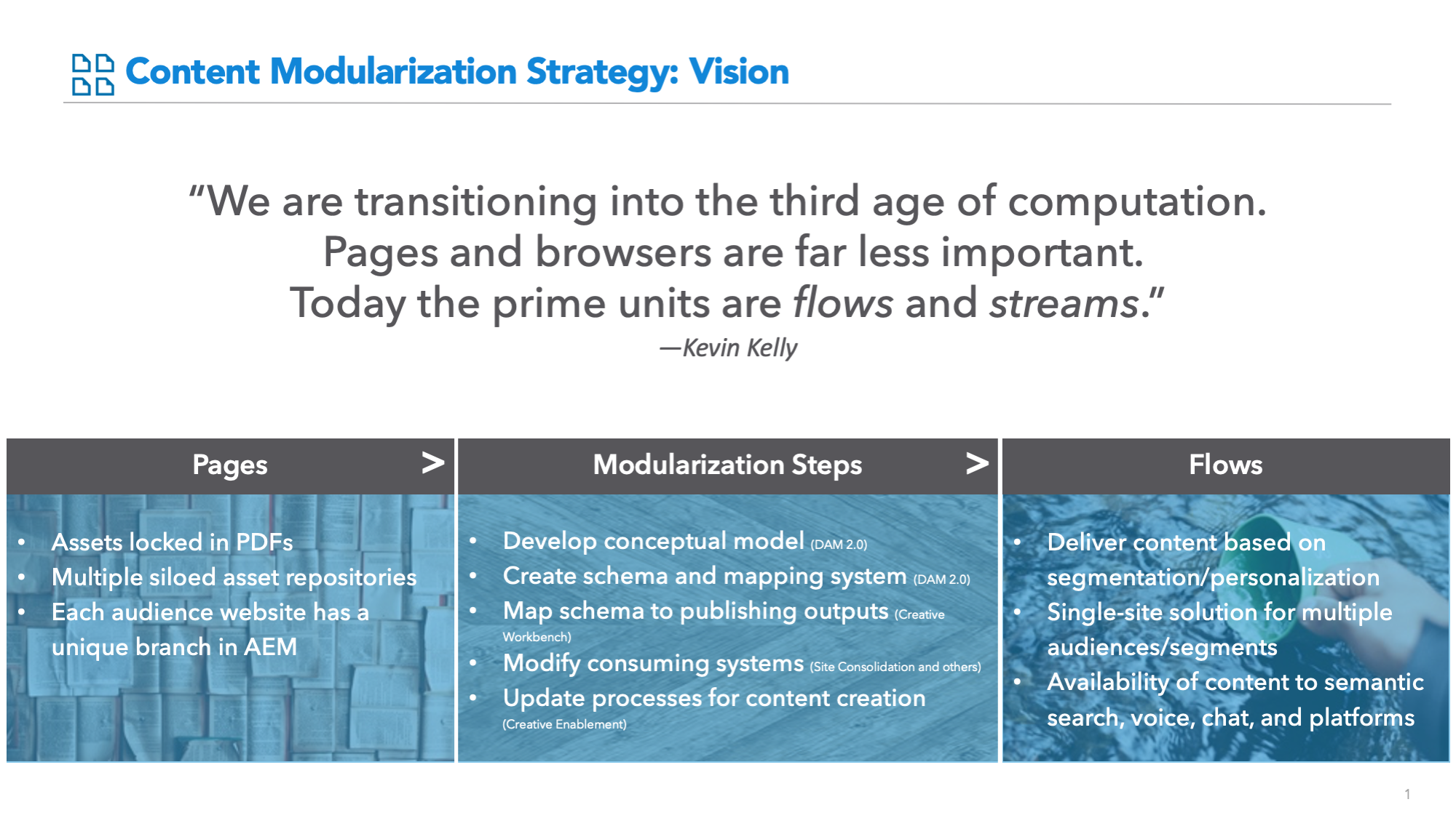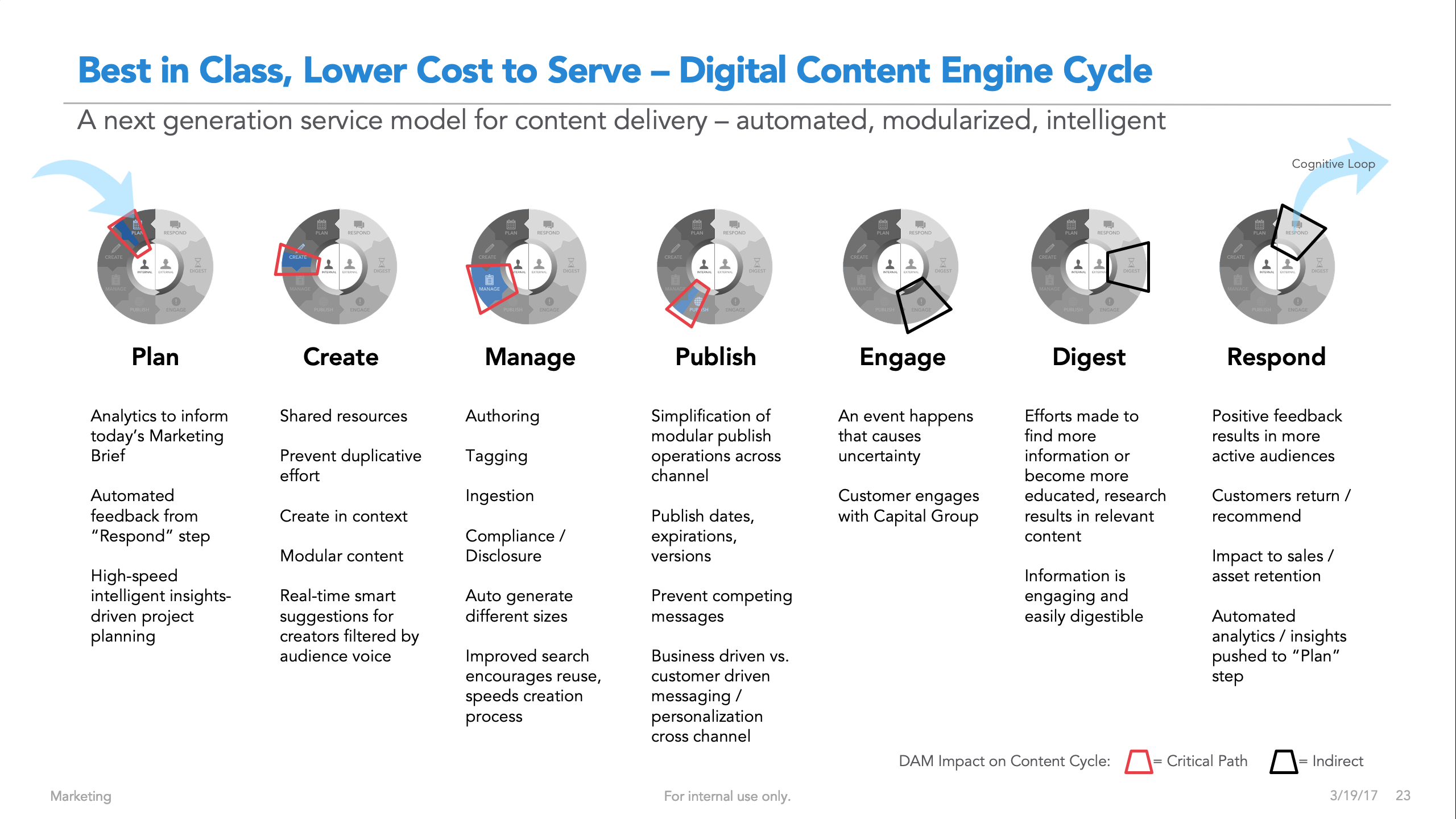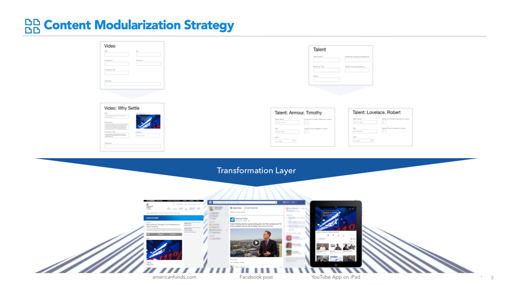 When I arrived at Capital Group, the company created content in a bespoke manner, approaching each deliverable as a blank slate. In addition, a pervasive print-first mindset resulted in most of the company’s content IP being locked up in PDFs, difficult to find and reuse.